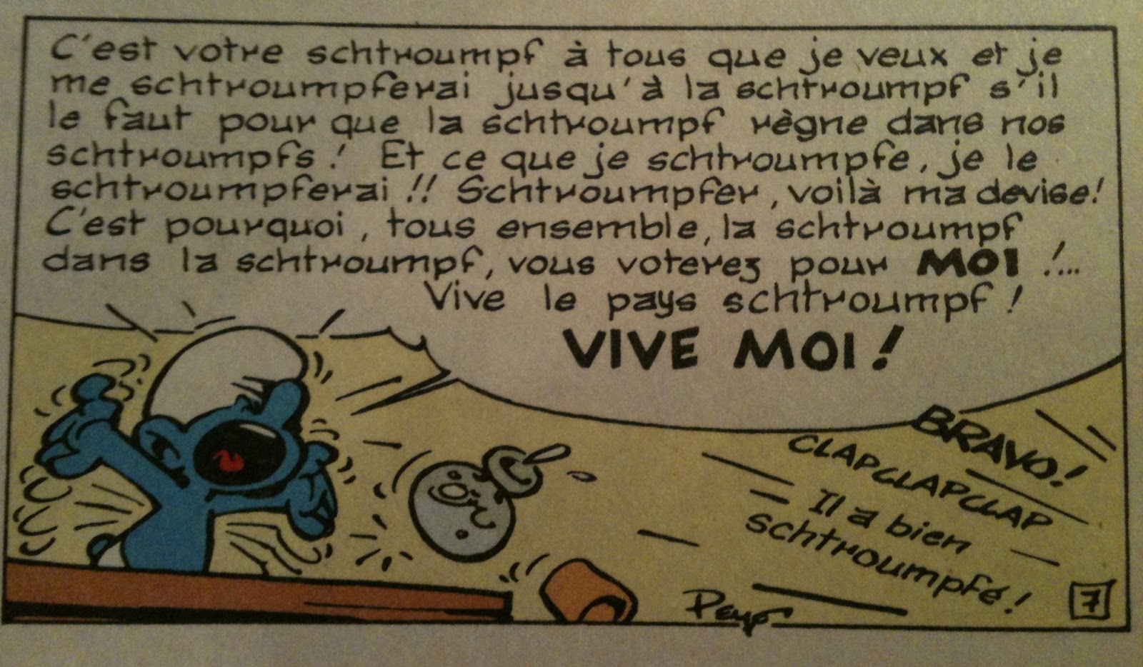 Vous aurez noté qu'à l'époque de la splendeur de cette BD dans Spirou, la multiplication de l'utilisation du vocable "schtroumpf" à tout bout de champ obligeait le jeune lecteur à réfléchir pour "traduire" le sens et trouver le mot correspondant à chaque fois ... :super:
